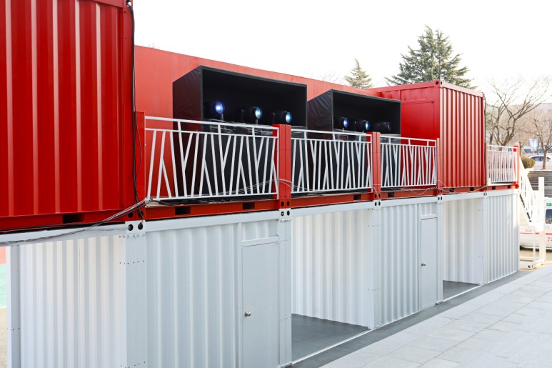 位于廣場(chǎng)另外兩邊的是兩個(gè)二層的集裝箱展柜,為現(xiàn)場(chǎng)的人提供演出的咨詢(xún)接待服務(wù),也可以在這里歇歇腳。這兩座集裝箱建筑的結(jié)構(gòu)都比較簡(jiǎn)單,為的是可以在短時(shí)間內(nèi)建成并投入使用。