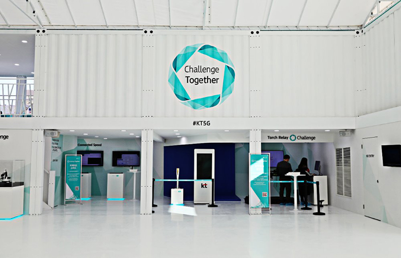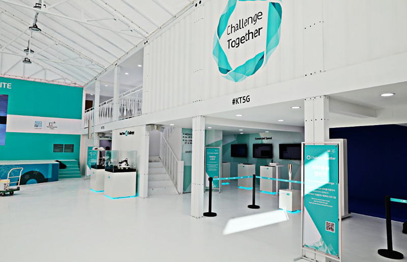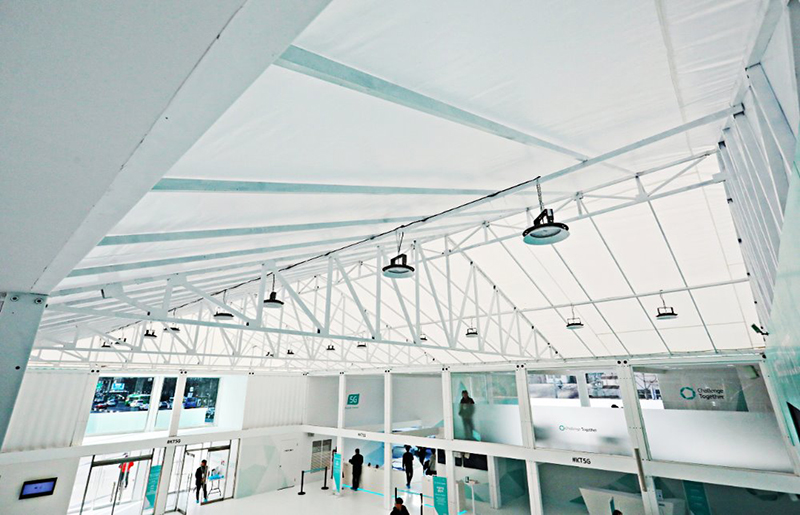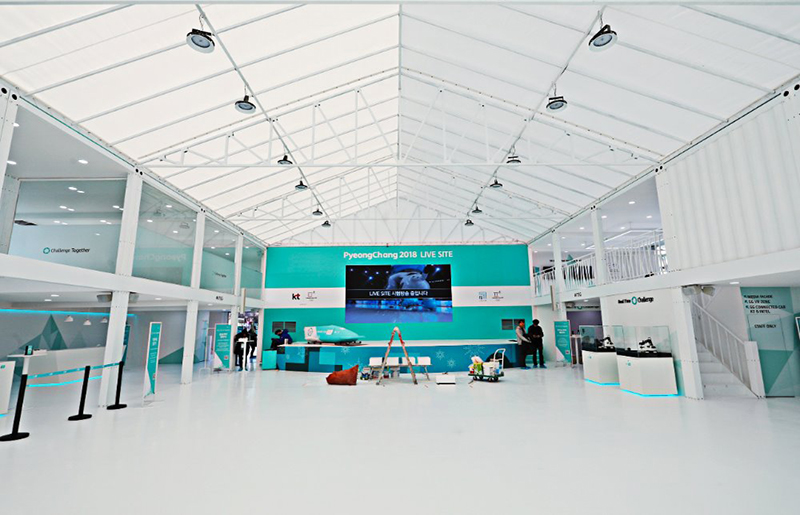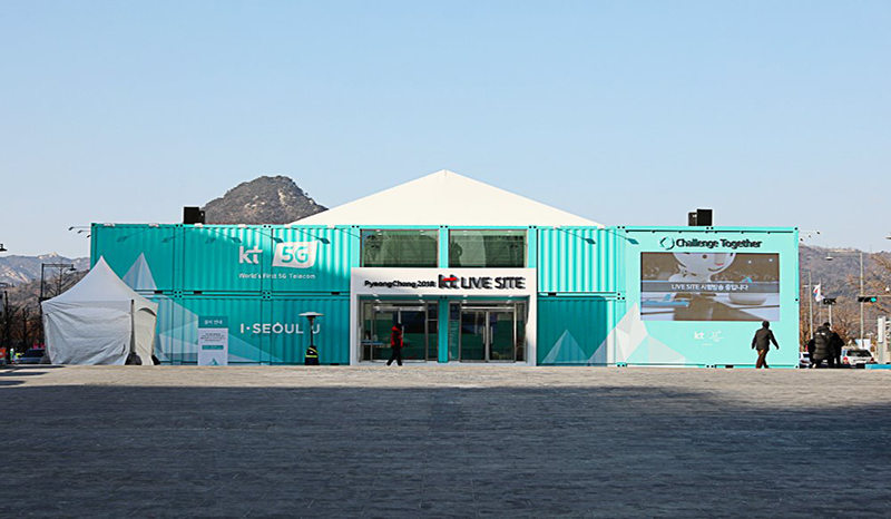 主體采用一塵不染的淺藍作為直播站的外觀,象征著韓國的藍天。由多個集裝箱拼接而成的大型建筑,箱身上有kt公司的標志和宣傳語,在規(guī)范尋常的建筑群中成功脫穎而出。