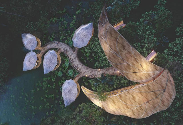 野奢的“奢”字,既指生活于自然之境的奢侈,也在強(qiáng)調(diào)硬件設(shè)施的品質(zhì)。風(fēng)餐露宿、日曬雨淋的戶外出游方式,只會(huì)將“出游”變成“吃苦”,旅途中非但得不到放松,身體反而更加疲憊了。因此,“奢”的意義就在于讓人們能夠安逸地去享受自然之野。但高品質(zhì)的酒店、民宿雖不難尋,可要想在自然之景中建設(shè)酒店、民宿,現(xiàn)代都市化的建筑就多少有些格格不入了。自然的美景是無與倫比的,好的野奢酒店設(shè)計(jì),當(dāng)是自然美景的“點(diǎn)睛之筆”,是從自然中“生長”出來的,而非突兀地佇立其中。