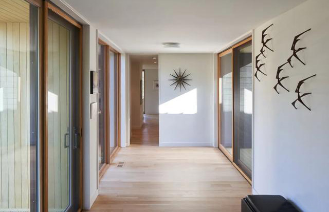 傳統日本房屋的一個顯著特征是使用了engawa,這是一種有頂覆蓋的連廊,通常用木材完成,沿著房屋的外圍延伸,作為房屋和花園之間的過渡。每個屋子在從內部空間到外部空間的過渡處都融入了單獨的engawa空間。這些有蓋門廊還通過在engawas的大型滑動玻璃門上方伸出懸挑,以幫助控制太陽熱能照射。