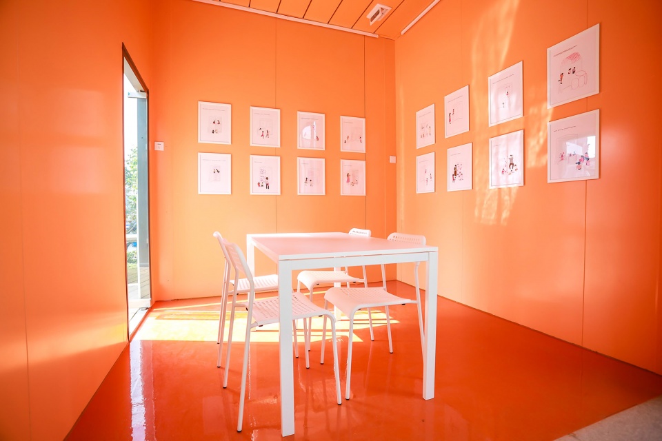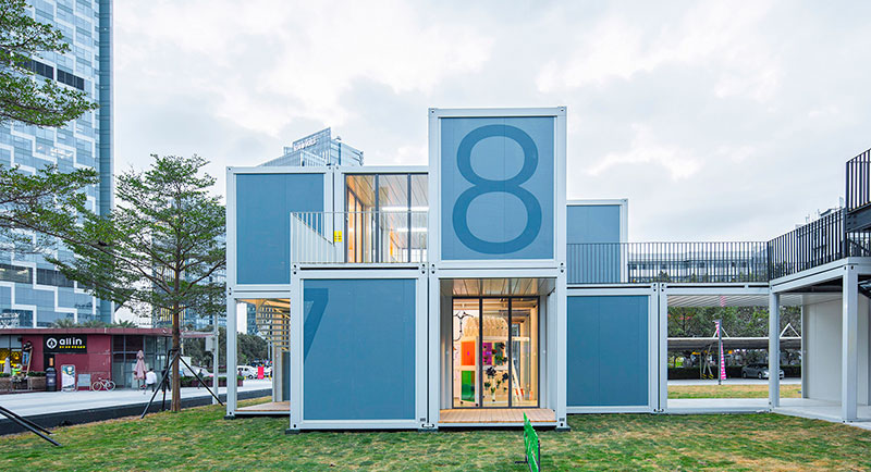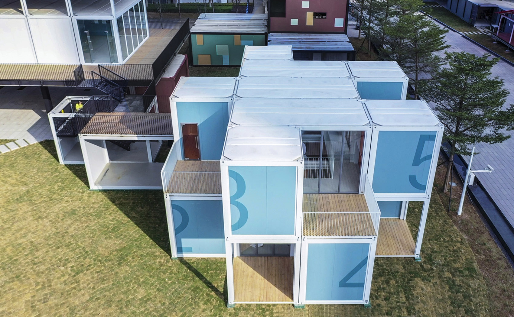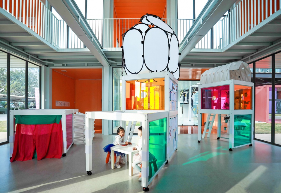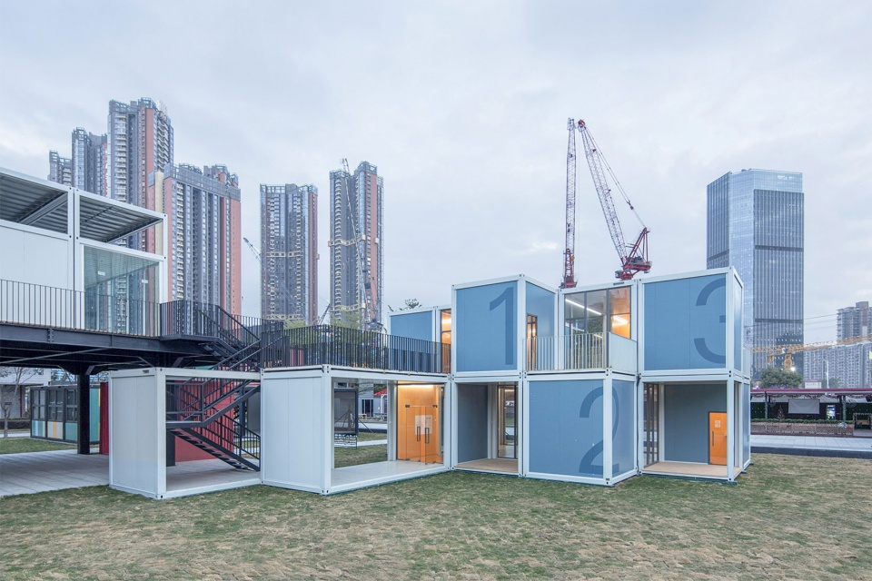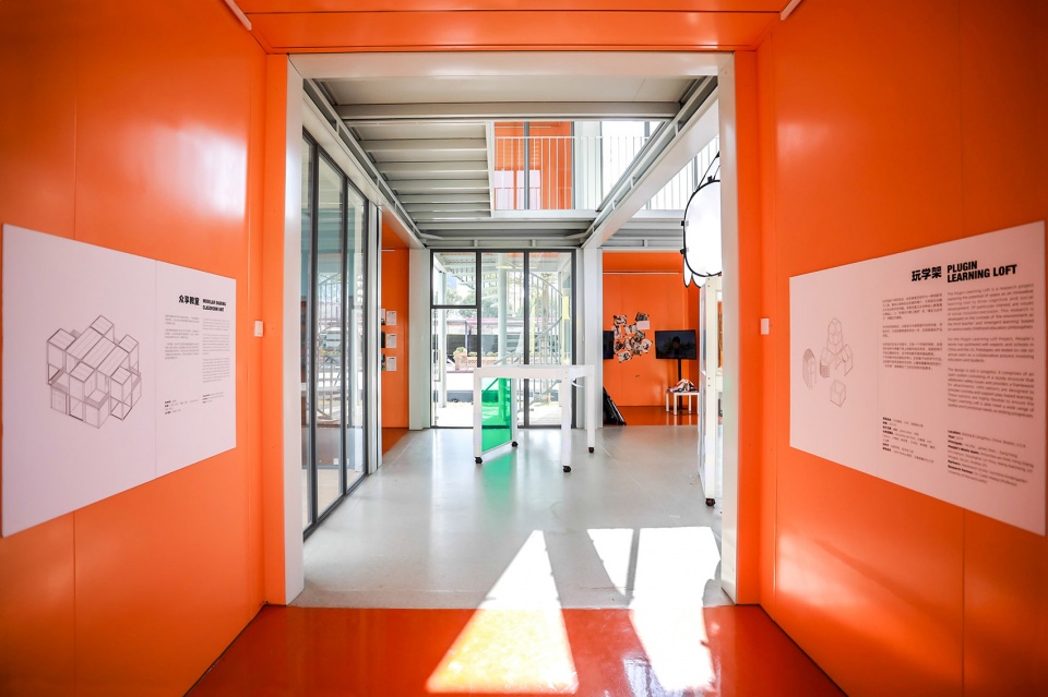 “玩學(xué)塊兒”旨在探討“破解上學(xué)難”的問題,即如何在城市閑置空地上快速搭建、以緩解城市上學(xué)難的痛點。為此,建筑采用中建科技的集成房屋模塊來建造,以框架式的箱體為基本預(yù)制單元,全部構(gòu)件在工廠生產(chǎn),現(xiàn)場安裝只花了3天的時間。展覽結(jié)束后可以全部拆除并重復(fù)利用。