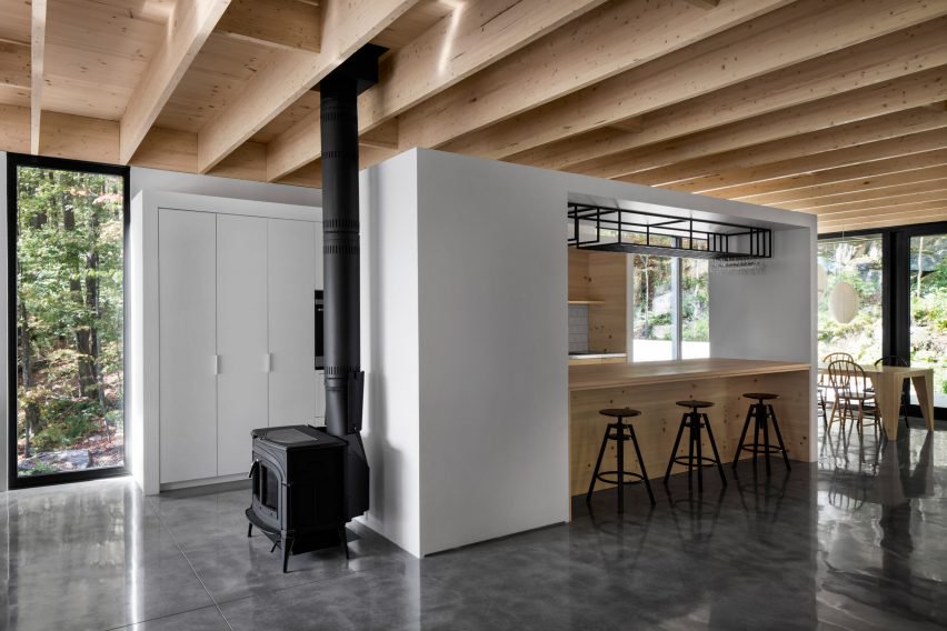 二樓的大部分空間是開放式的客廳和餐廳,兩者被一個擁有島式操作臺的廚房分隔開來。落地玻璃窗圍繞著餐廳的角落,餐廳可以步入連接著山坡的一個木質露臺。