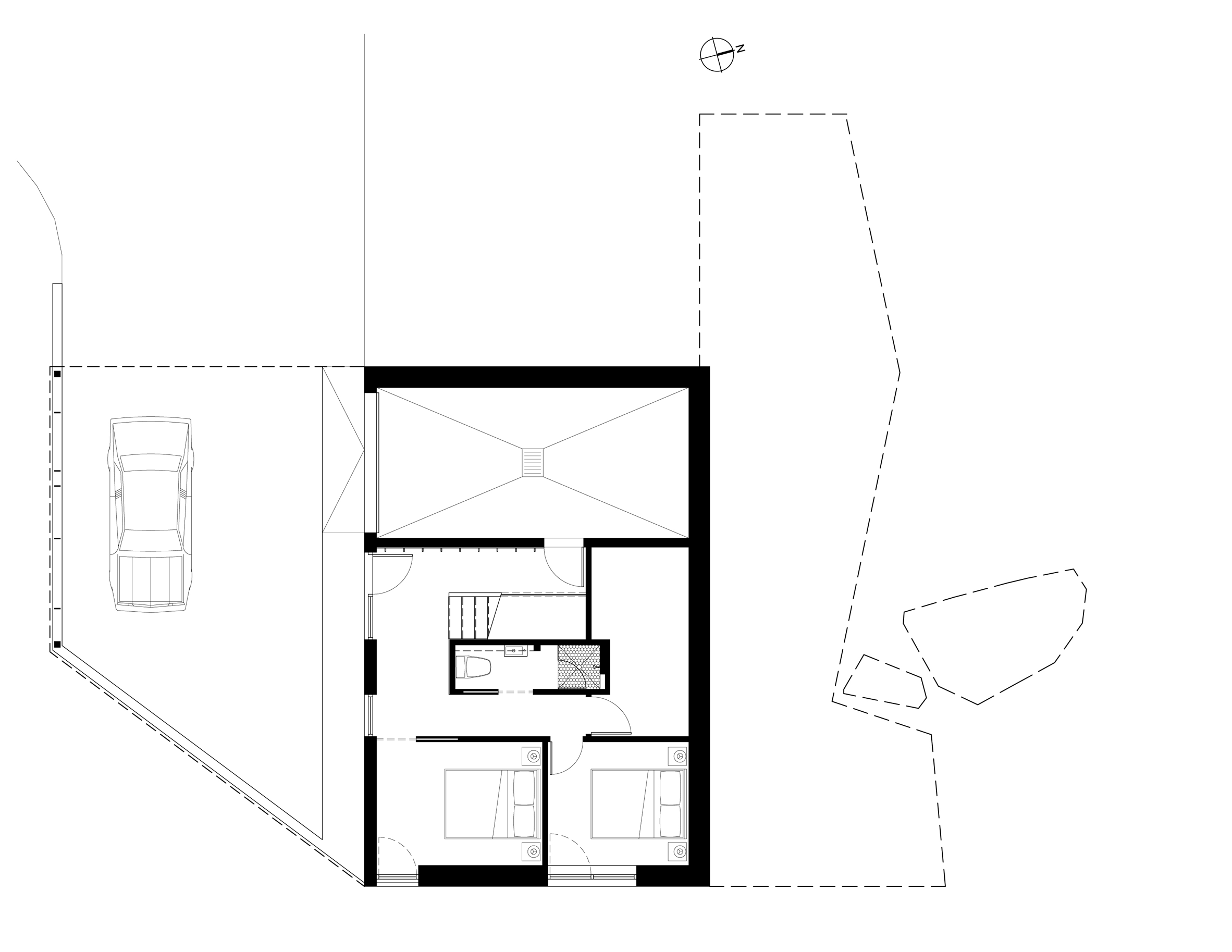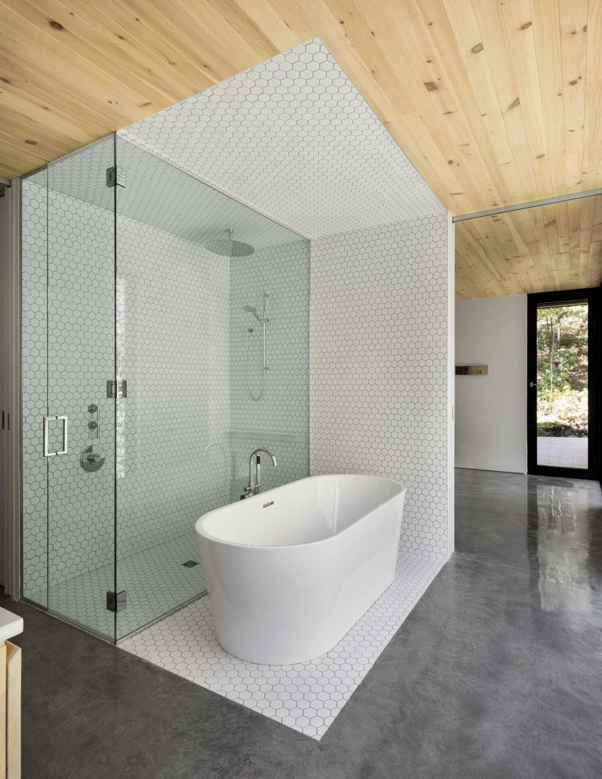 一間擁有浴室和儲物間的主臥室也位于頂層。主浴室由白色瓷磚鋪貼,包含一個浴缸和一個玻璃淋浴房。白色的墻壁,拋光的混凝土地板和木質的天花板形成了整個室內的風格。