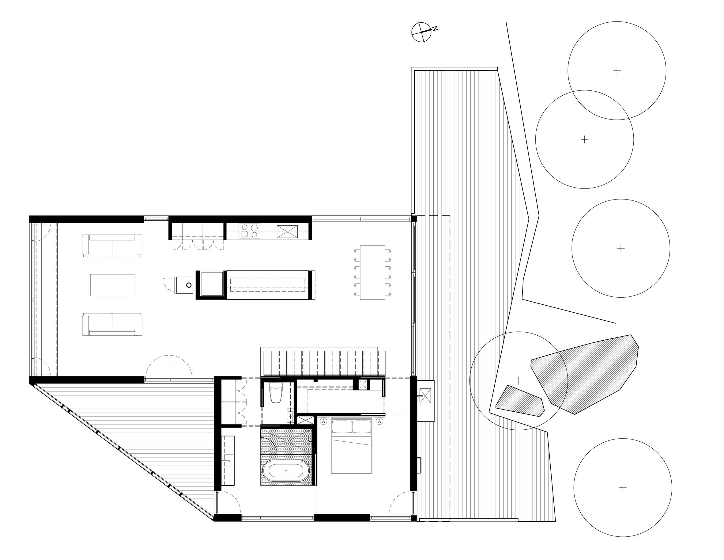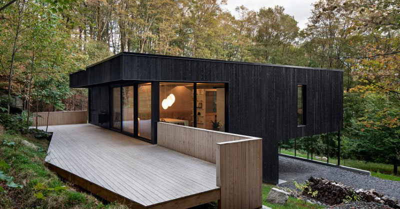 該建筑名為“巖石”,建筑面積2300平方英尺(701平方米),立面的木材被涂上黑漆。房子建在山坡上,上方是一座森林覆蓋的小山和一條碎石車道,下面是一片平坦的草地。