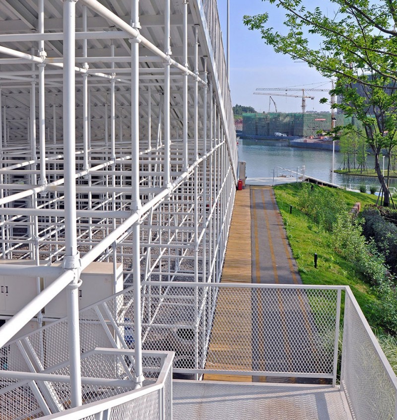 由于項目臨湖,旱雪滑道的布置與湖岸線垂直,將朝著湖岸方向“滑雪沖刺”的過程作為項目的核心體驗。采用兩根滑道分行的方式,由統一的前場準備區進入,一邊是直接接入的初級道,方便小朋友穿著雪鞋不用穿行太遠距離;一邊是通過搭接的腳手架構筑平臺,上升到與湖面高差15米的中級道出發平臺,體驗更有速度的滑行感。