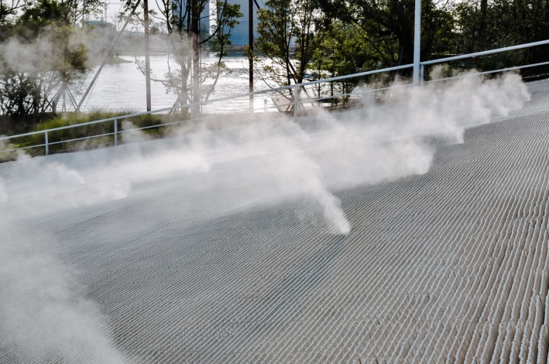地面霧噴系統是保持滑道濕潤度、減小滑行中的摩擦和阻力,提高體驗者的滑行速度的一個巧妙布置。