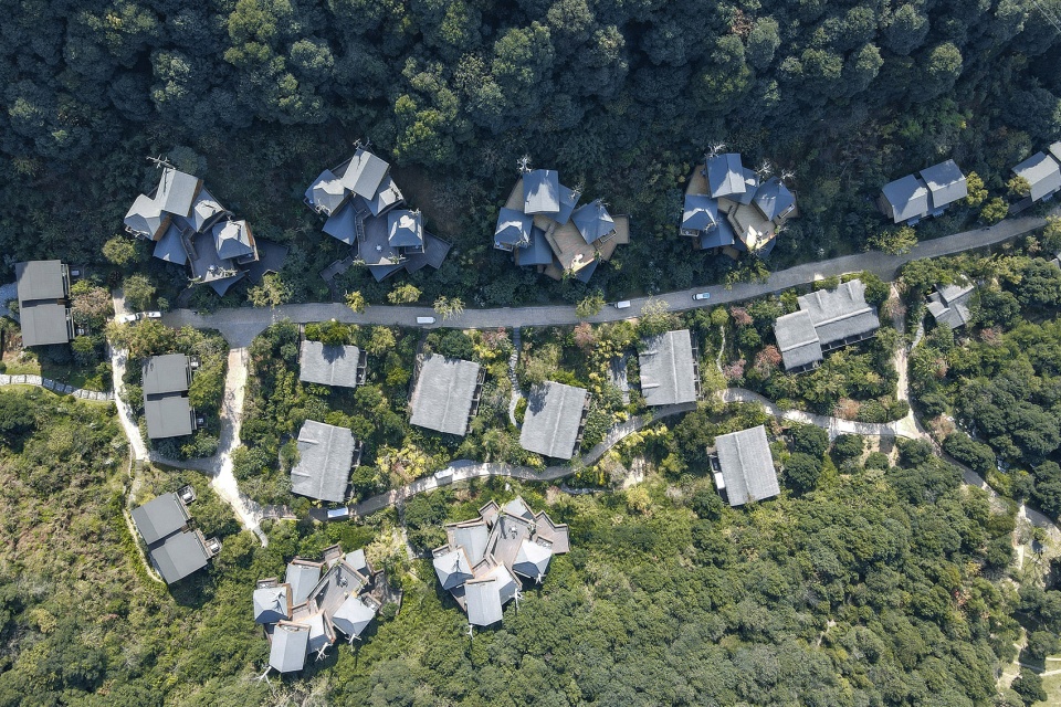 將抽象化的居住建筑原型進行堆疊的設計,無論在歐洲還是日本都有先例,但更偏于幾何形體操作,空間體驗也常局限于室內。基于這個項目的商業性質以及所處的山野環境,我們把設計的重點放在了抽象與形象、室內與室外、幾何與自然之間的均衡狀態。因此“對偶與平衡”的手法貫穿于設計的各個方面。仿真的枯樹干直接喚起了自然中的巢居意象,但避免枝繁葉茂的過度寫實;坡屋頂基本不出檐,保持簡潔的幾何體特征,但每間都有陽臺凸凹,原初的方案立面也呼應周圍的林木蔥蘢;單體房間與自然樹木相偎依,而形體的穿插關系又保留了一定的人工化狀態。